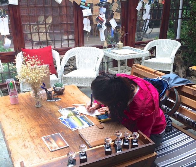 On a dreary day in Shuhe (束河), the all-day drizzle turned heavy; it was time to look for shelter for an hour or so. Found a not-too-crowded cafe that does decent coffee, sells postcards, and even posting them out for customers. Yay. Didn't even need to hunt down a post office. Whether the postcards would reach their eventual destinations, would be another matter altogether. But mind-boggled that this can operate as a mini-business. There were many of such cafes around town, offering different postcards and stuff for customers.
