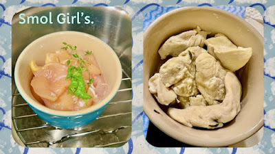 The Smol Girl scored herself some steamed chimken too. We got bone-in thighs and two whole drumsticks plus two pieces of breast meat for us, and 200g of tenderloin fillets for her. I was too lazy to haul out the utensils to sous vide. Steaming her tenderloin fillets in a ramekin in a pot was a lot quicker and neater. Heh.